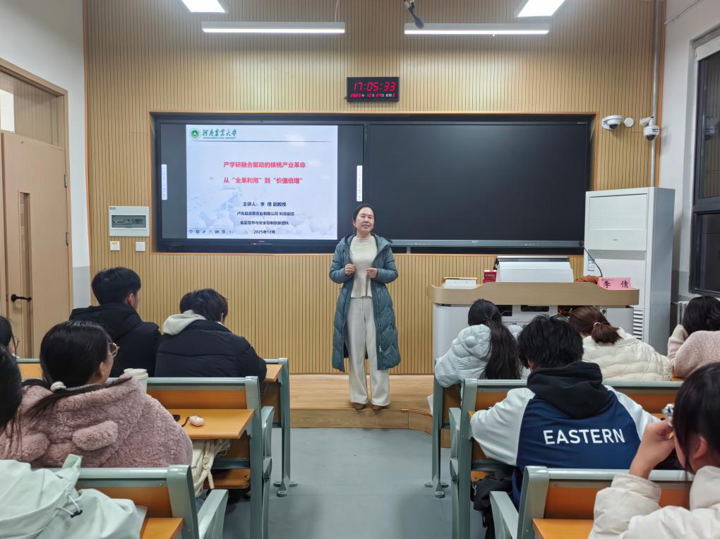 (通讯员 赵鑫宇)为助力 2025 级新生洞悉农产品加工领域的机遇与痛点,搭建科研与产业融合的沟通桥梁,食品科学技术学院“未来领航员”计划第八期行业前沿讲座于12月24日在文化路校区三号楼顺利举办。学院食品营养与安全控制创新团队核心成员、卢氏县原荣农业有限公司科技副总李倩副教授以《产学研融合驱动的核桃产业革命——从“全果利用”到“价值倍增”》为题,为全体新生带来了一场聚焦核桃产业高值化、兼具实践深度与应用价值的专题分享。