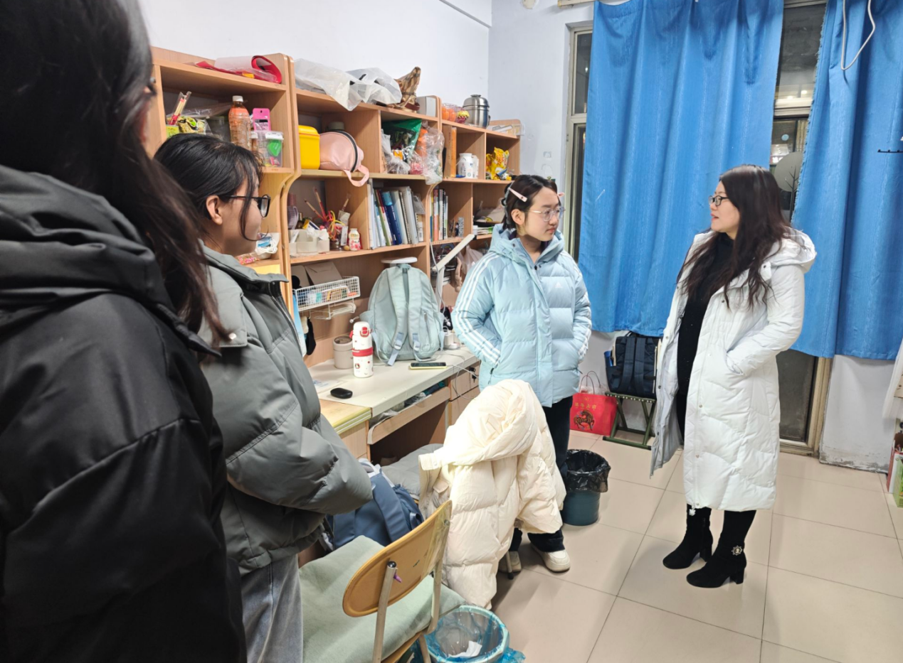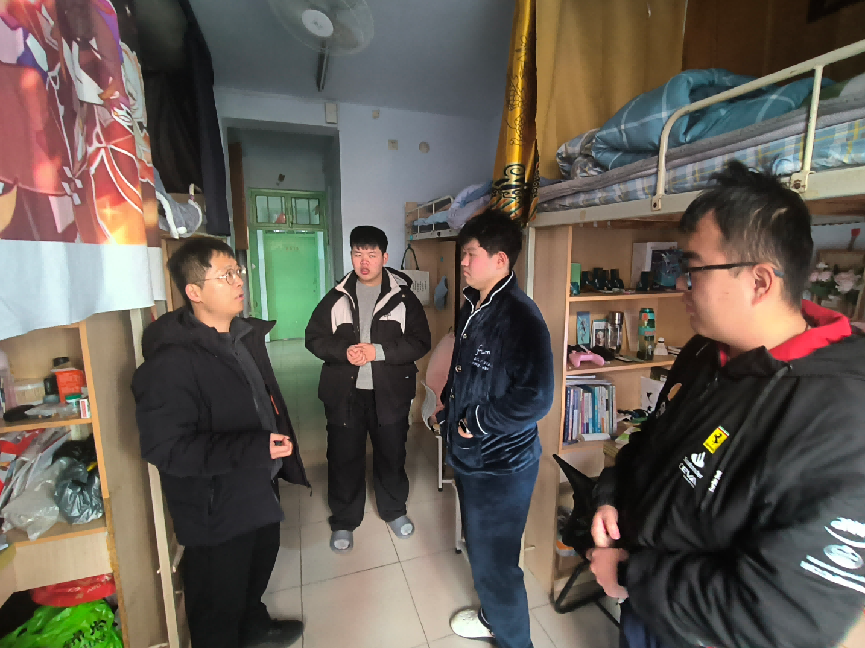 1月7日,院党委组织员陈翔、团委副书记张金龙、辅导员喻颢如、银峰、班主任老师深入学生宿舍进行走访排查。在排查中,老师们围绕用电安全,卫生状况等方面展开了细致检查,叮嘱同学们重视宿舍用电安全,自觉维护宿舍卫生环境,同时对正在积极备考的同学们表达慰问,了解大家的复习进展与生活需求,提醒注意防寒保暖、合理作息,并且鼓励同学们保持积极乐观的心态,以最佳状态迎接考试。此外,老师们着重开展诚信考试教育,引导同学树立正确的应考观念,维护公平公正的考试环境。